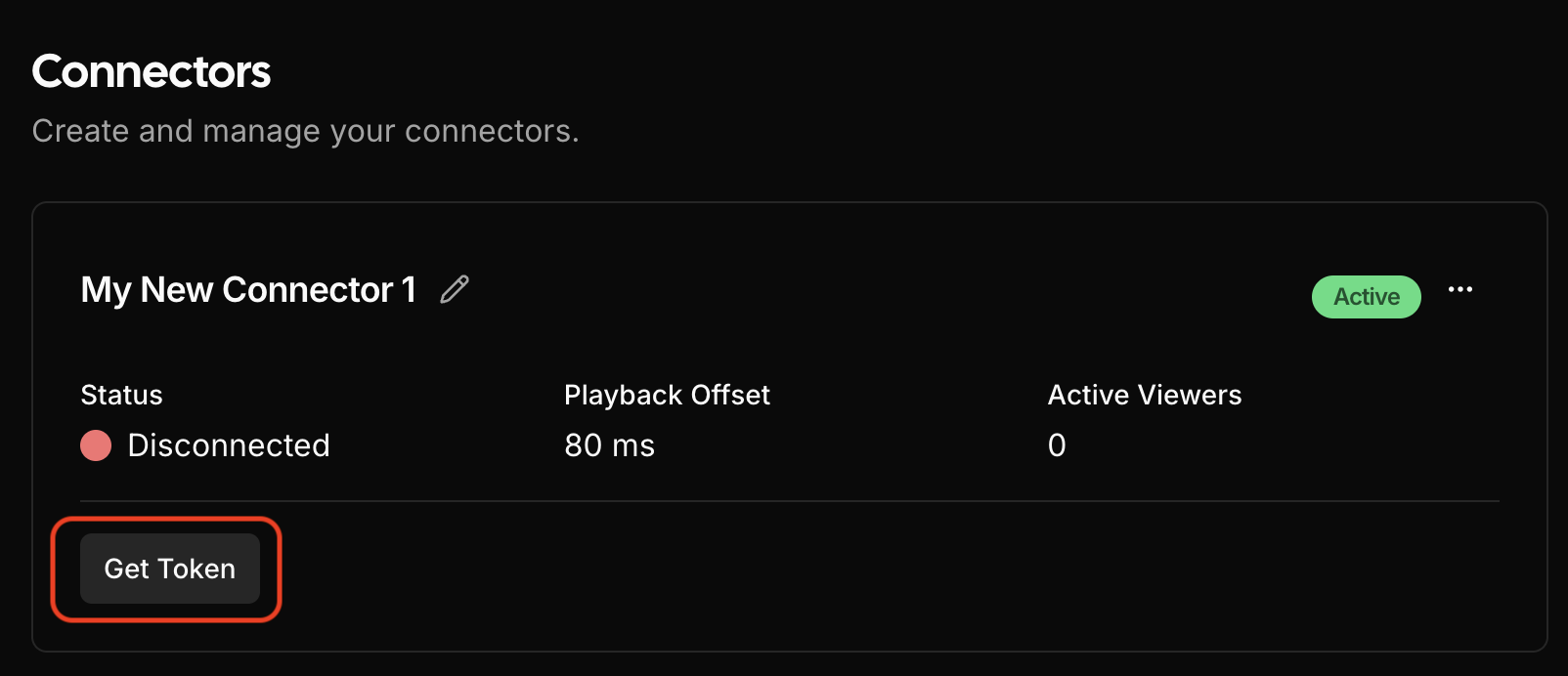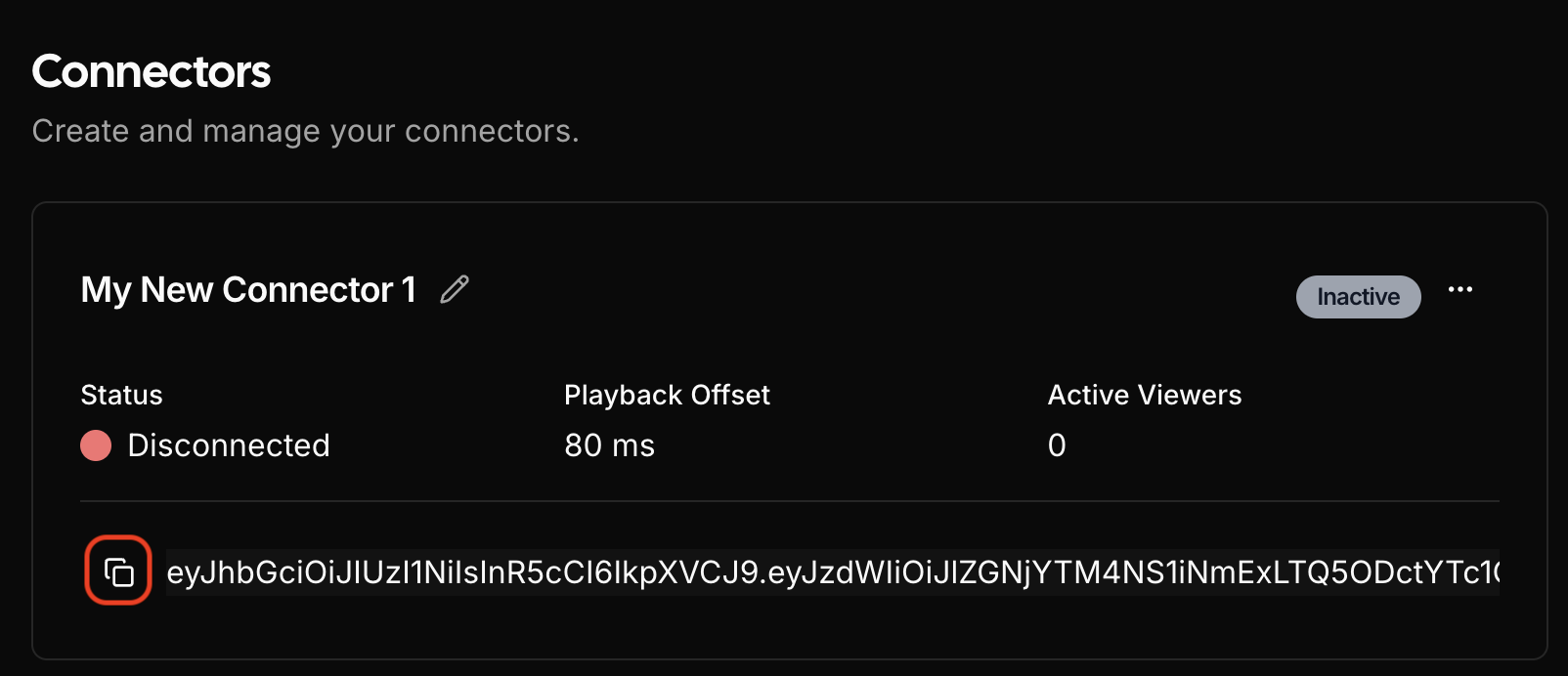 After creating the connector you will see a button at the bottom of the connector card that reads Get Token. Click the button and the token will be revealed. Either click the copy button at the far left or select the token and copy it.
