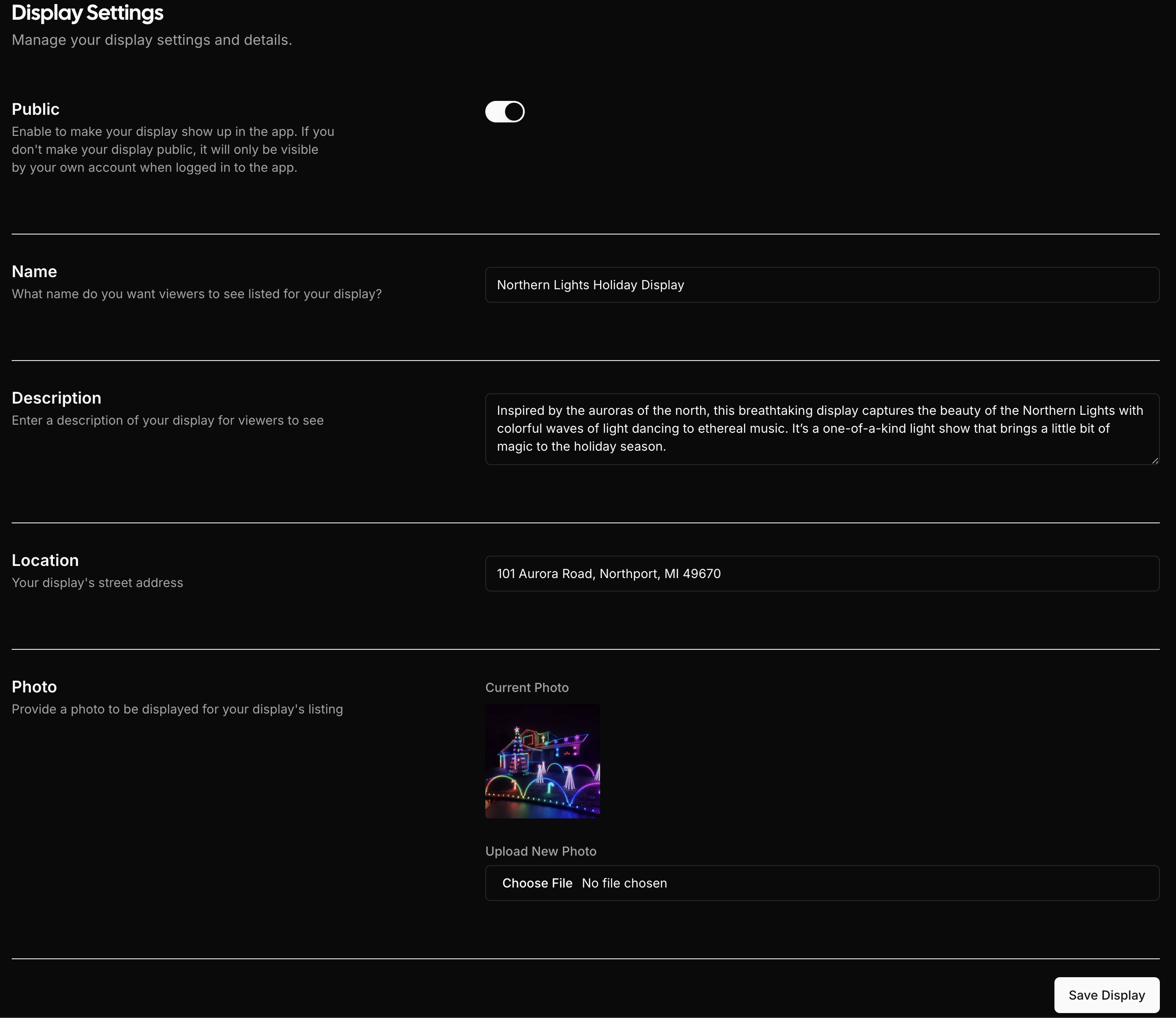 Once logged in, navigate to the Display section. Here, you'll need to fill in the details of your display, such as the name, location, and any other relevant information. This information is used to create your display's public entry in the PulseMesh app.
