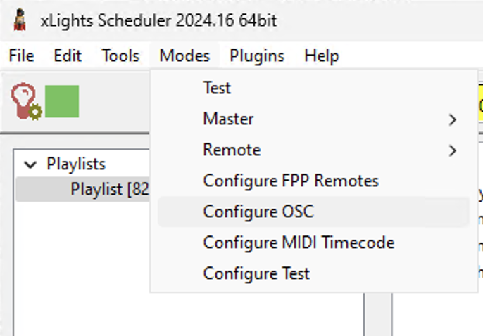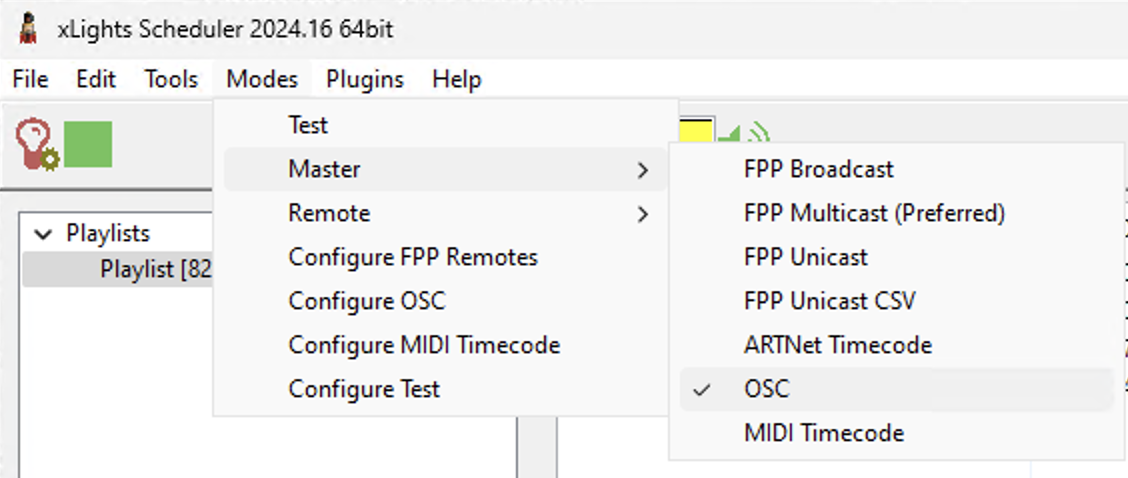 Navigate to the Modes dropdown in xSchedule again. This time select Master > OSC. If you reopen Modes > Master again you should see a checkmark next to OSC.